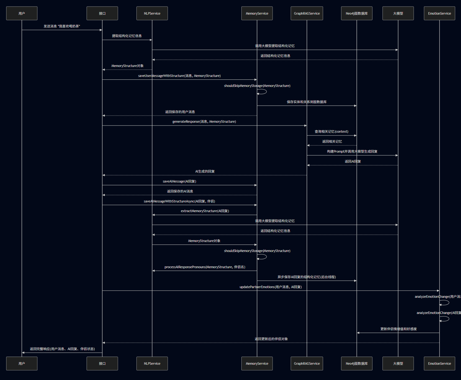 在聊天过程中,将伴侣自己的话以及用户的话要提取关键信息,比如人名、事件等进行记忆,存储到图数据库中。